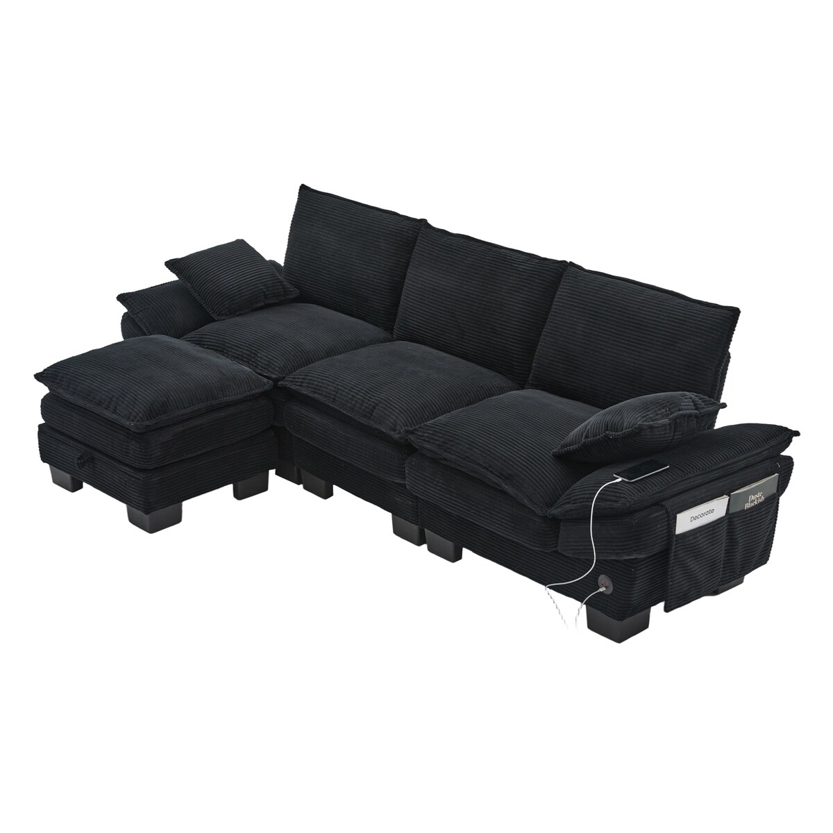 Merax 4-Sitzer-Sofa mit 2x Hocker, USB-C-Anschluss & Seitentaschen, Dicke Kissen, Corduroy, Schwarz