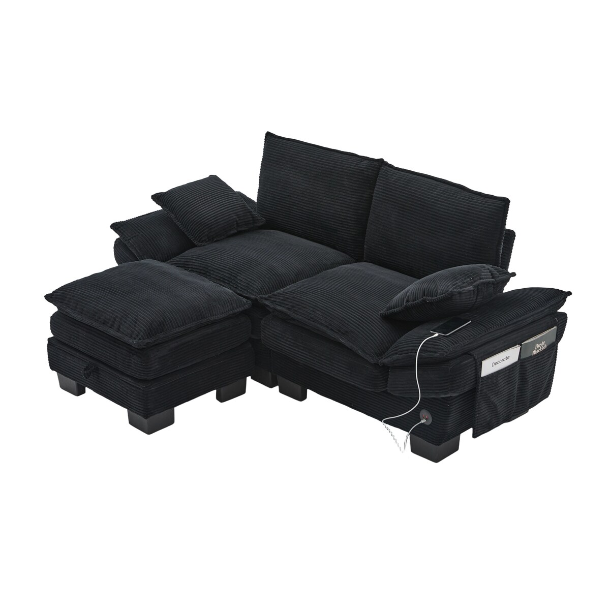 Merax 3-Sitzer-Sofa mit Hocker, USB-C-Anschluss & Seitentaschen, Dicke Kissen, Corduroy, Schwarz