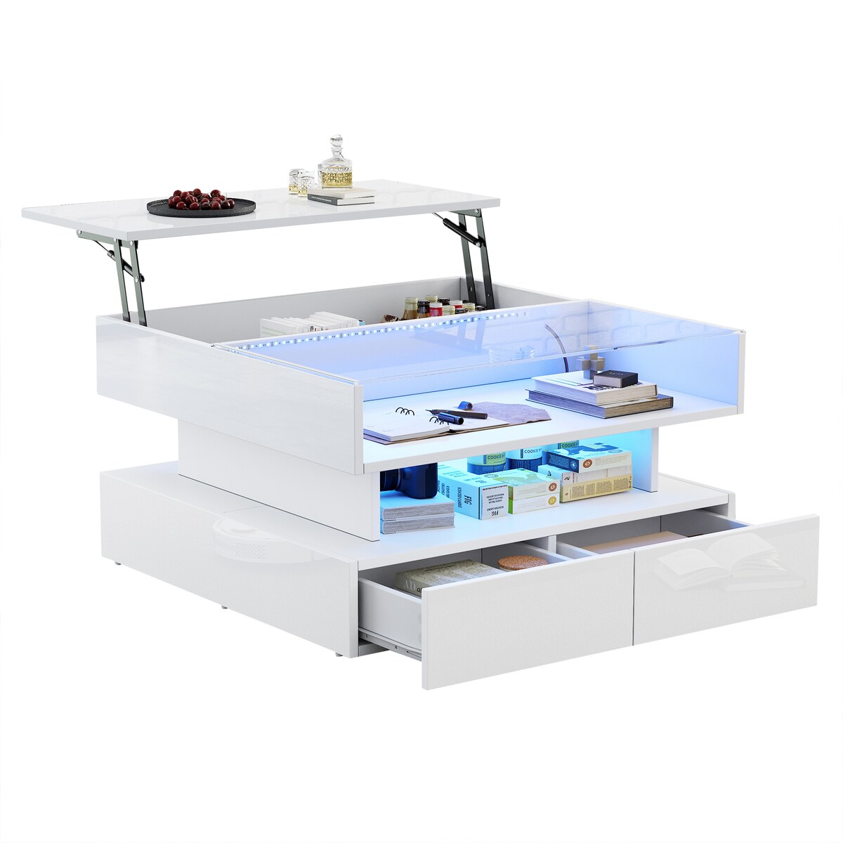 OKWISH Hydraulischer Couchtisch 95x50x34 cm Hochglanz Weiß LED App Steuerung 1 Schublade 1 Schrank halboffener Stauraum Spanplatte