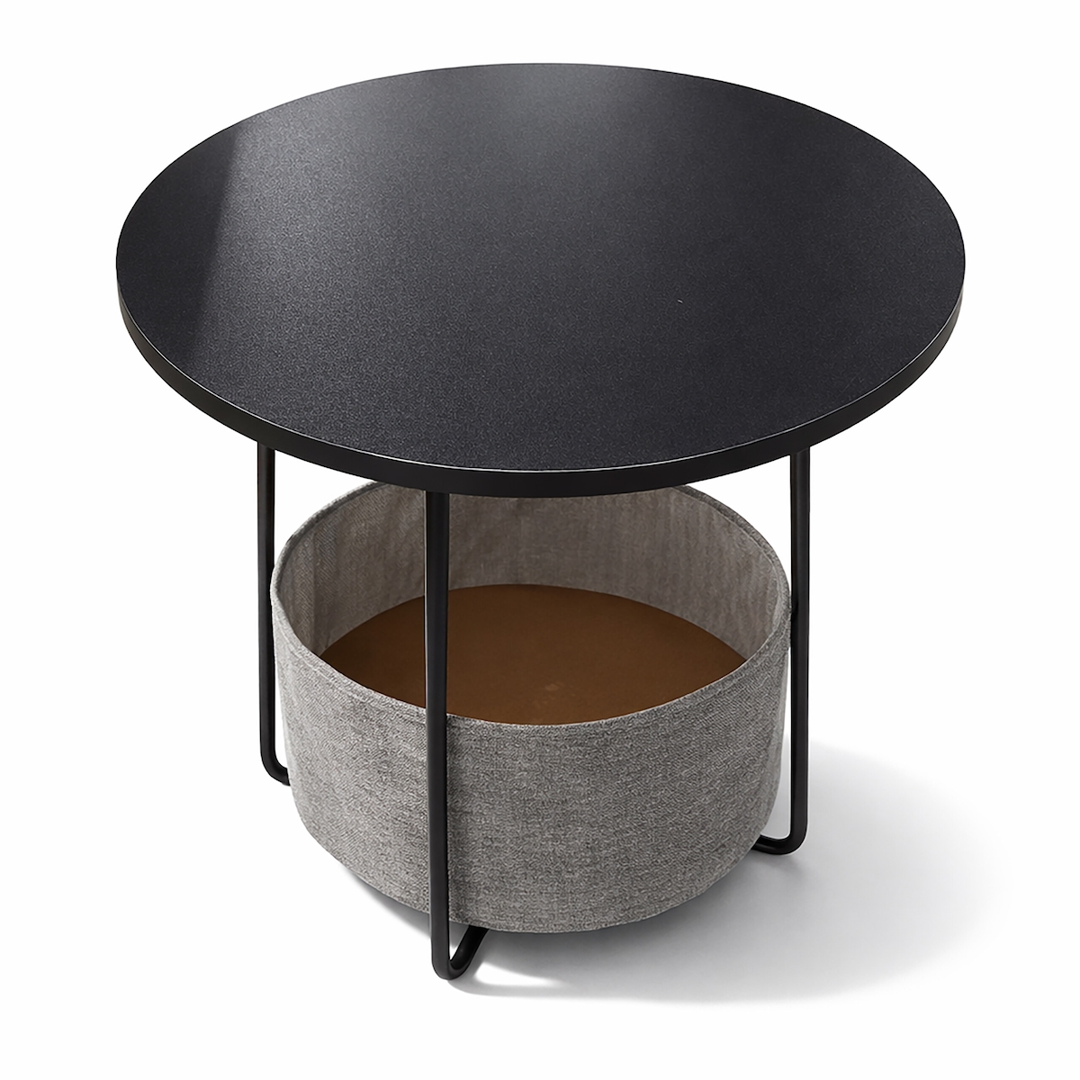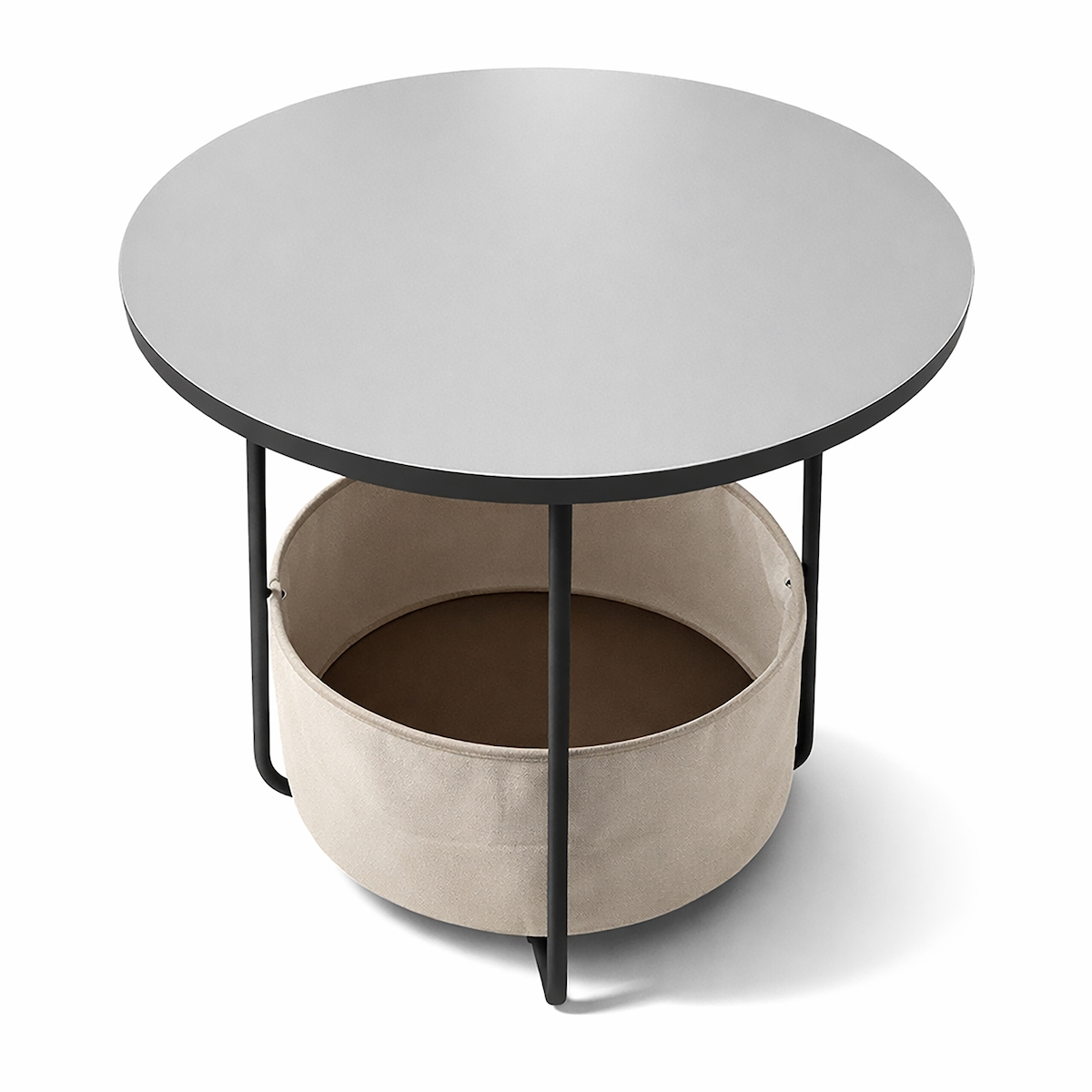 Relaxdays Beistelltisch, runder Couchtisch, mit Stoffkorb, HD 50x45cm, Kaffeetisch Wohnzimmer, MDF, Metall, schwarz-grau