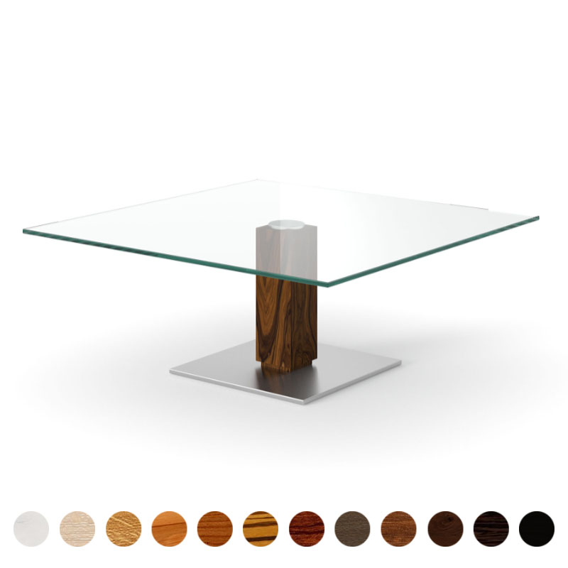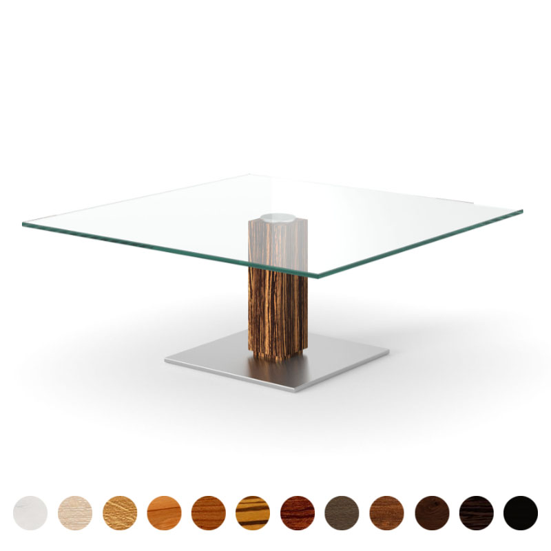 Hochwertiger Couchtisch mit Glasplatte und Massivholz Zebrano Mittelsäule Luzern