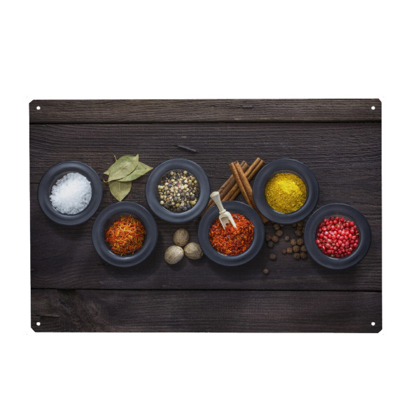 Holzbild "Gewürze" artboxONE - Essen & Trinken - Gewürz,Kochen,Küche,Restaurant,Pfeffer,Genuss,Aroma,Currypulver,Salz,Safran,Essen,Muskatnuss,Chili