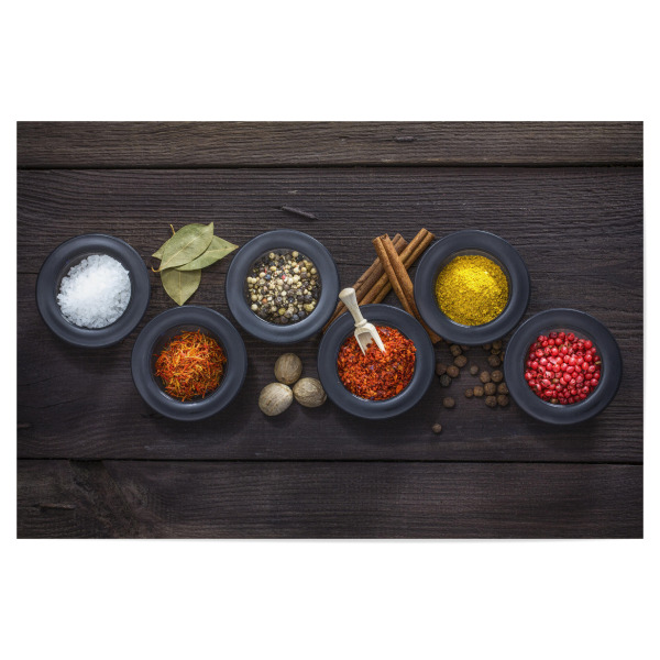 Poster "Gewürze" artboxONE - Essen & Trinken - Gewürz,Kochen,Küche,Restaurant,Pfeffer,Genuss,Aroma,Currypulver,Salz,Safran,Essen,Muskatnuss,Chili