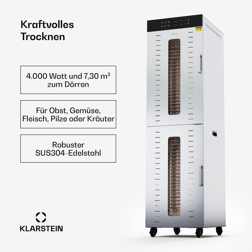 Klarstein Dörrautomat Edelstahl – 4.000-W-Dörrgerät, 40 Edelstahl-Einlegeböden, 2 Trockenkammern, 30–90 °C, 24-Stunden-Timer, 6 Ventilator...