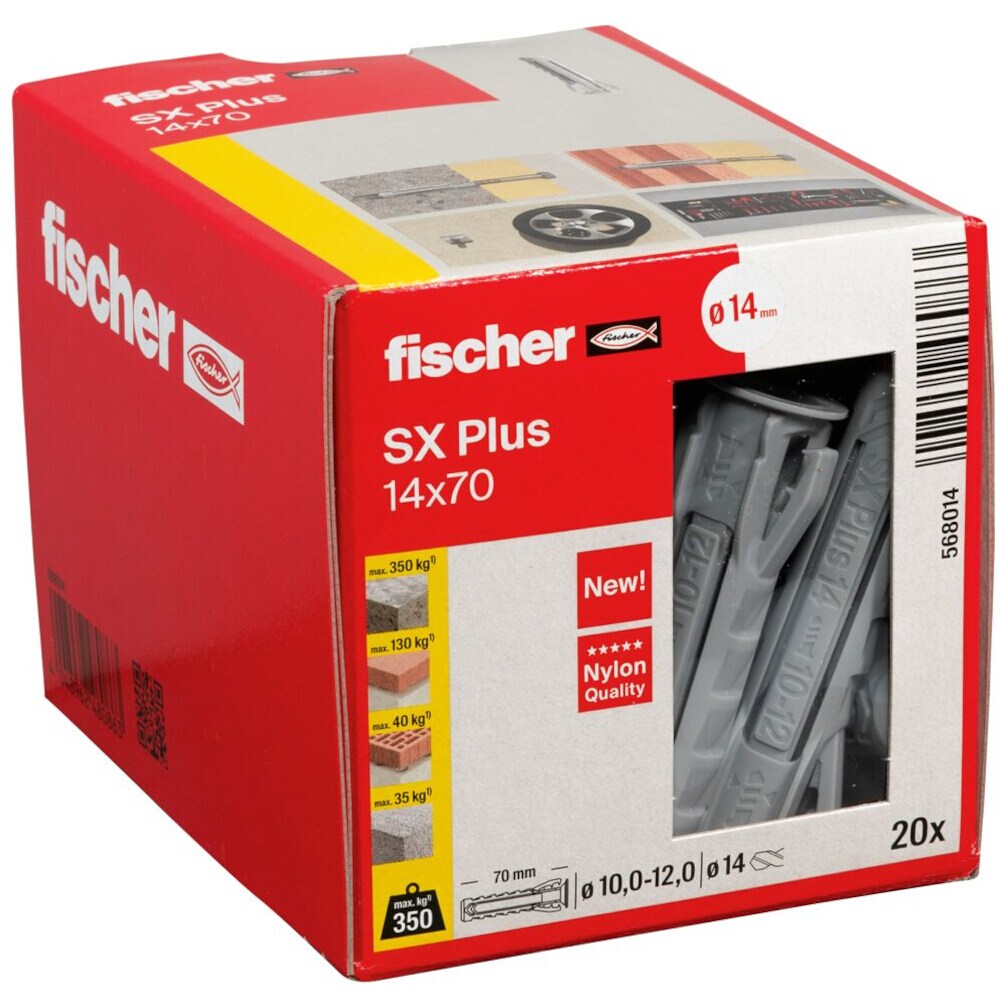 FISCHER Spreizdübel, Ø14x70mm, Kunststoff, Nylon, 90mm, Ø10-12mm, Mit Rand, Geeignet für Gasbeton, Dübel SX