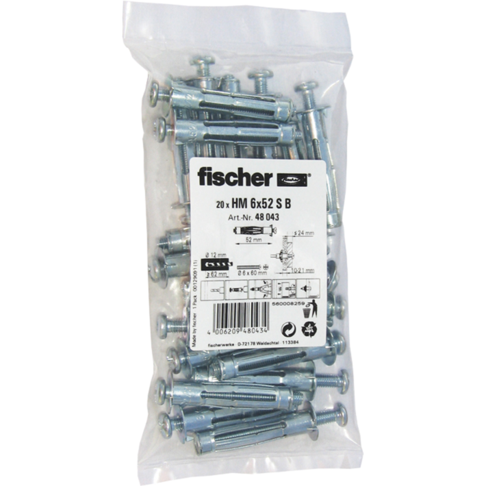 fischer Hohlraum-Metalldübel HM 6x52 S B Dübel, silber, 20 Stück, mit Schraube
