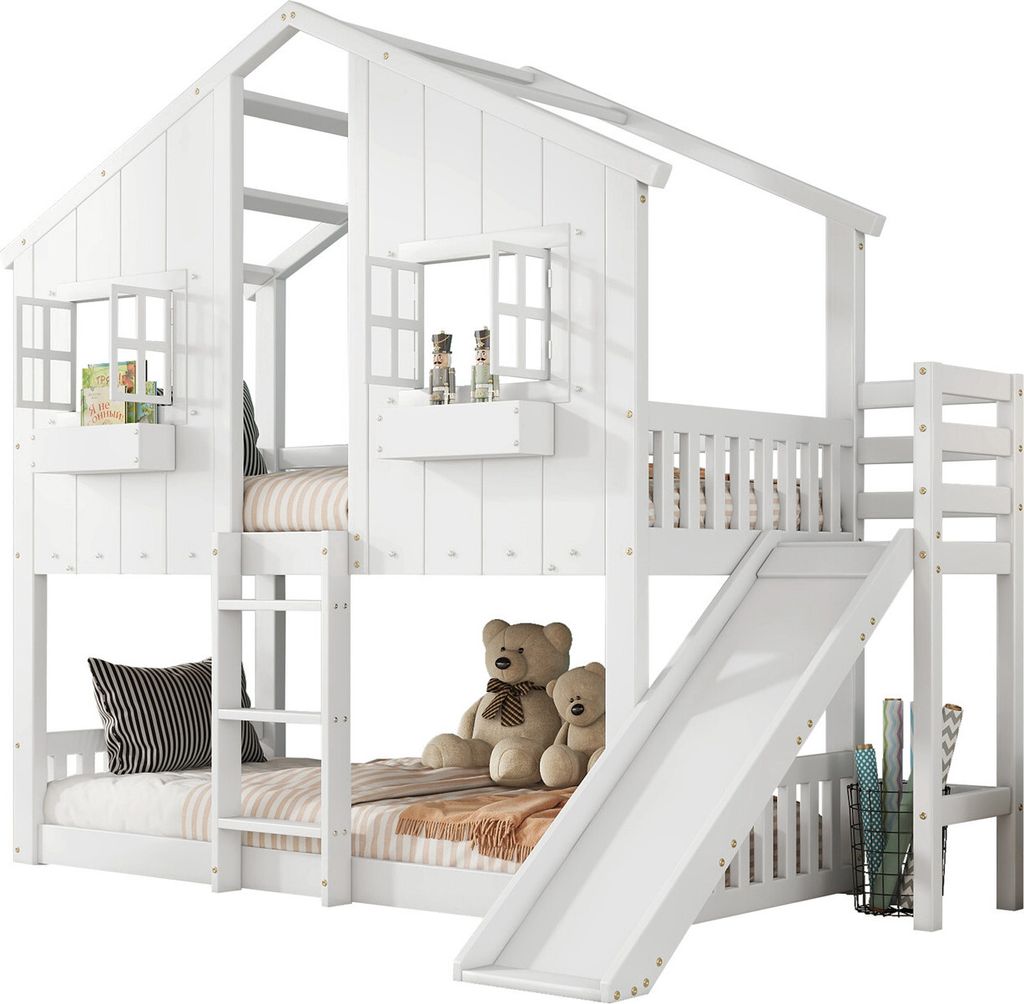 Etagenbett mit Kinderrutsche Dach und Fenster Fallschutzgitter Dreistufiger Leiter Kinderbett Hausbett Jugendbett 90x200cm Weiß