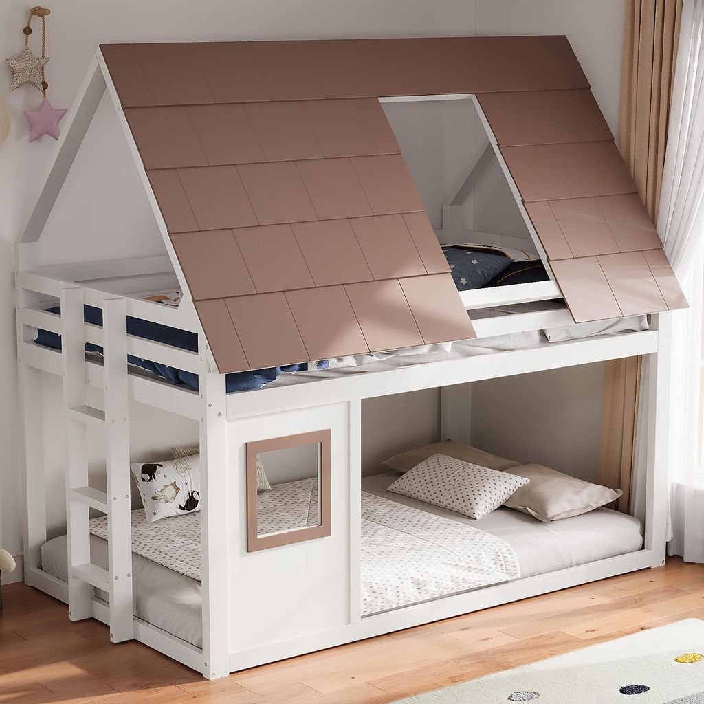 okwish Kinderbett 140x200 Etagenbett mit Dach und Leiter Doppelbett mit einem kleinen Fenster Hausbett Braun+Weiß (ohne Matratze)