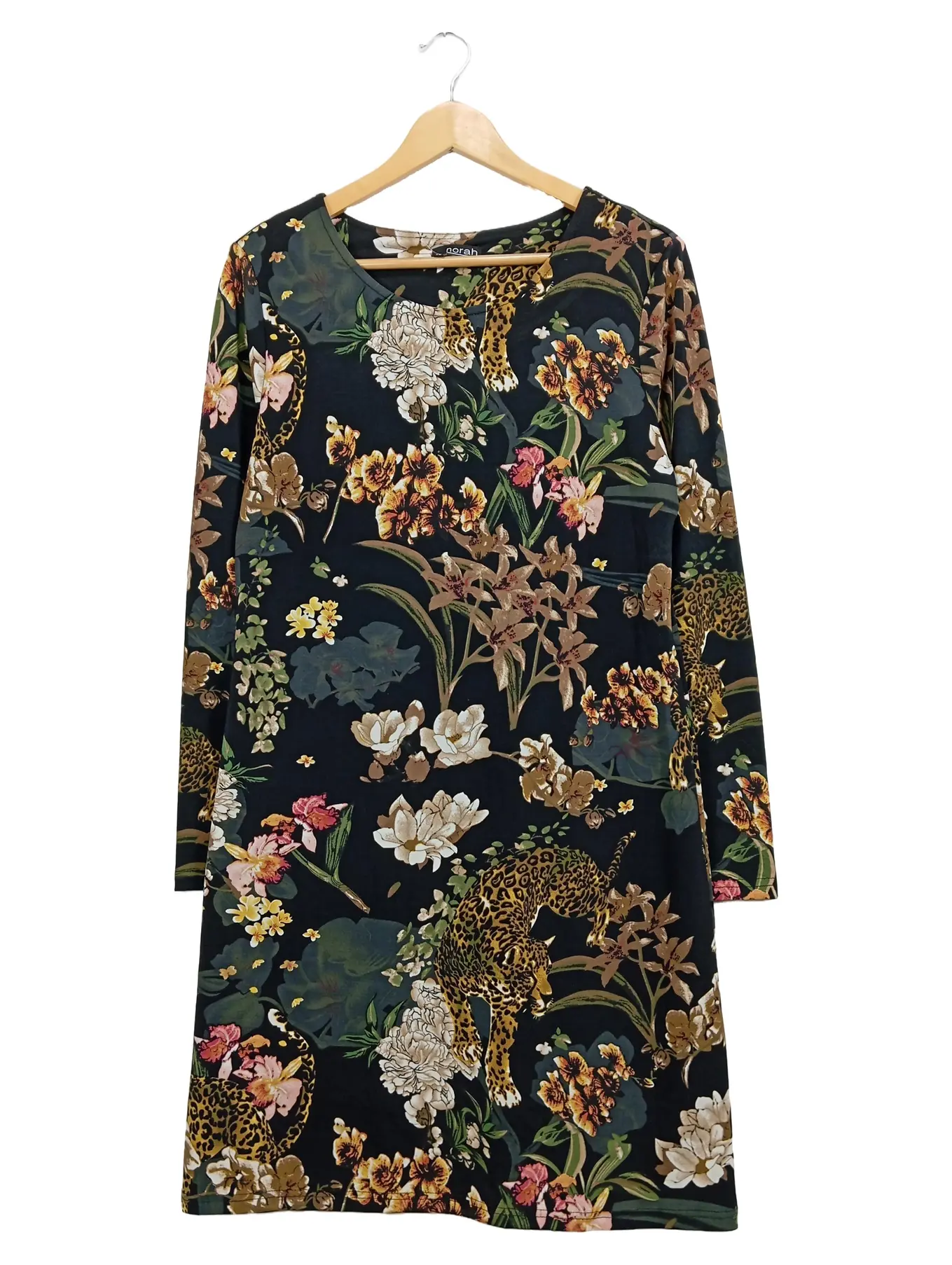 MARKENLOS NORAH Damen Kleid Gr. 38 Langarm Leopard Blumen Print Schwarz