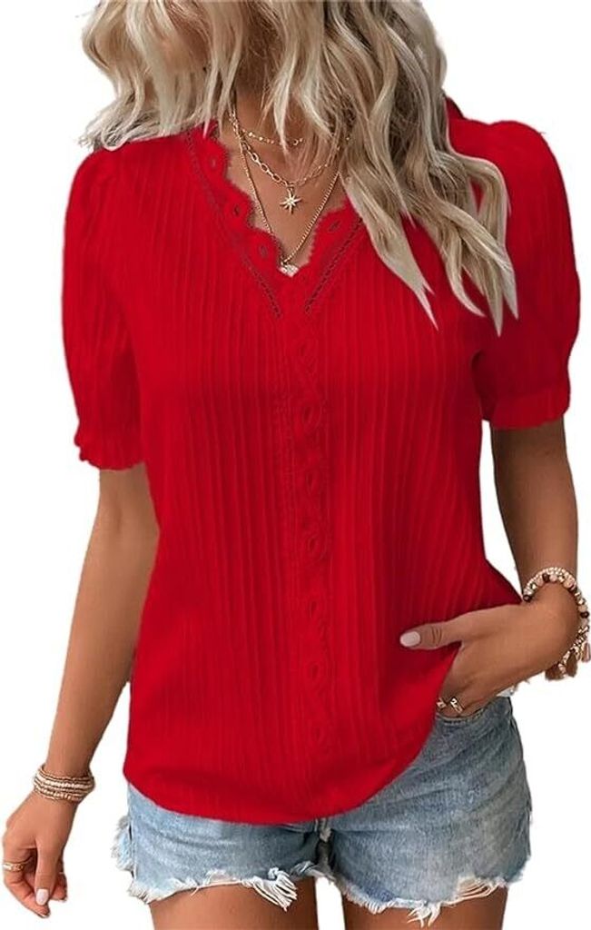 Bluse Kurzarm Damen Spitzen Oberteil V Ausschnitt Shirts Elegant Puffärmeln Damenblusen Sommer Schickes Hemd Tunika