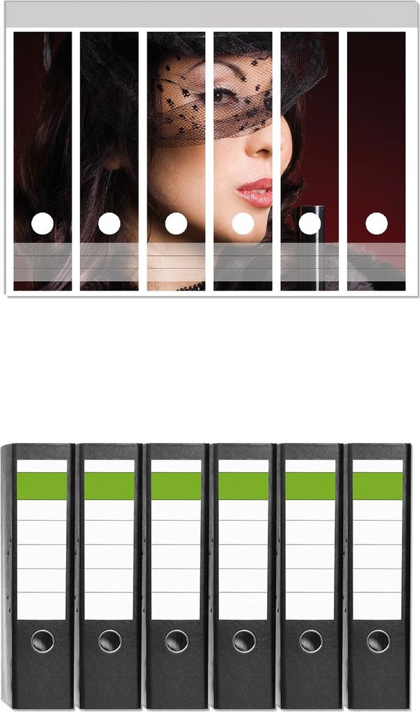Wallario 6 Stück breite Ordner inkl. Klebeetiketten mit Motive Lady in Black - Sexy Dame mit gefährlichem Charme - Set mit Rückenschildern / Ord...