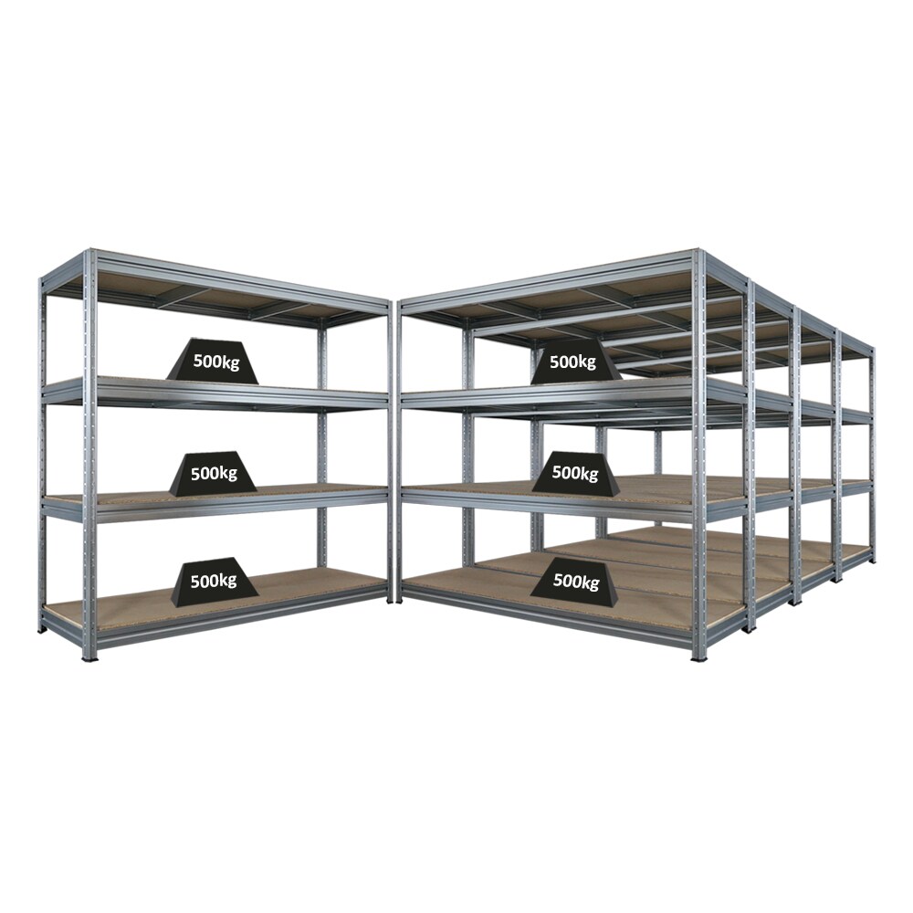 Proregal Mega Deal | 5x Schwerlastregal DINO | HxBxT 180x200x60cm | 4 Spanplatten-Ebenen 16mm | Fachlast 500kg | Verzinkt