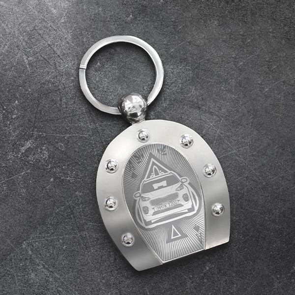 Personalisierter Hufeisen Schlüsselanhänger mit deinem Auto und Kennzeichen mit Gravur Chrome-M im Design Spades Card. - auto4style