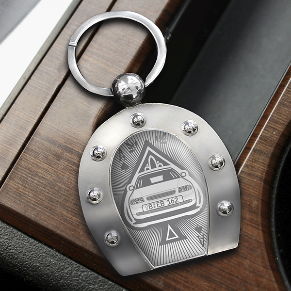 Personalisierter Hufeisen Schlüsselanhänger mit deinem Auto und Kennzeichen mit Gravur Chrome-XL im Design Spades Card. - auto4style