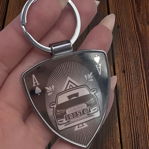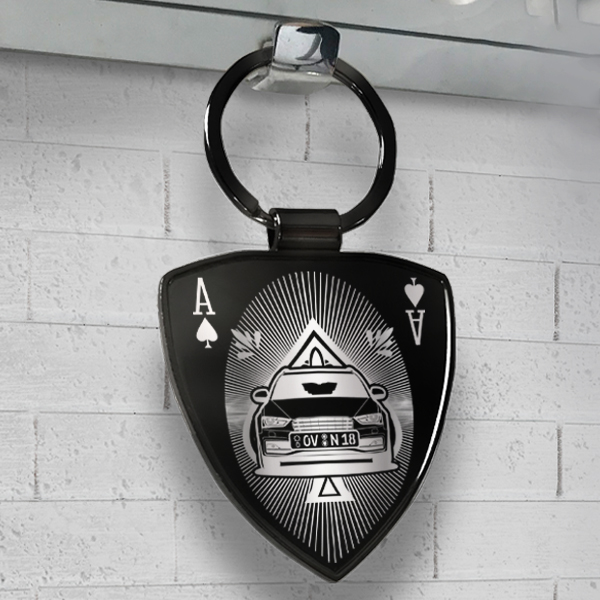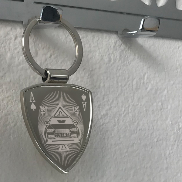 Personalisierter Schlüsselanhänger Schild mit deinem Auto und Kennzeichen mit Gravur Premium-M im Design Spades Card. - auto4style