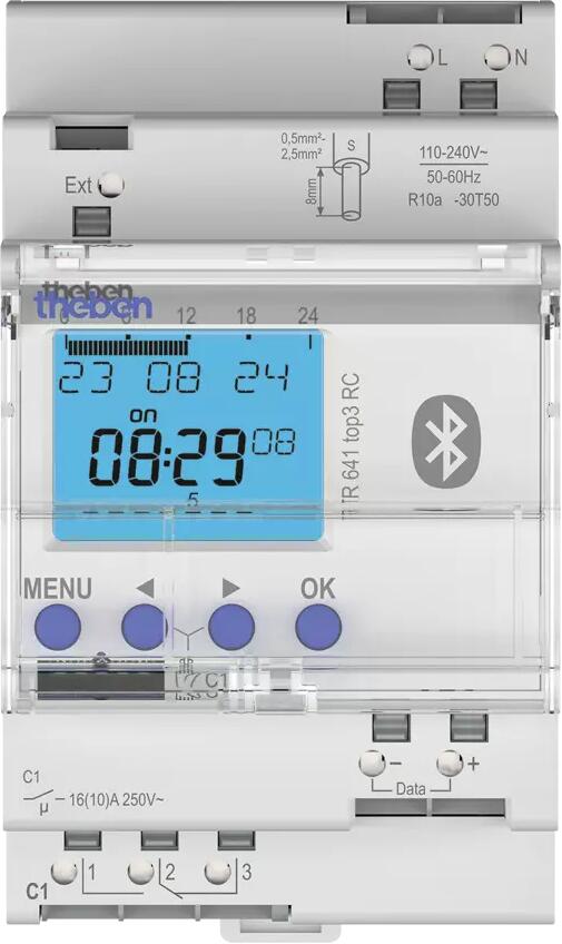 Theben TR 641 top3 BLE RC Digitale Zeitschaltuhr 1 Kanal, Hutschiene, 3TE, Jahresprogramm, Astro, Bluetooth, 2 ext. Eingänge (Taster/Schalter), Antenn
