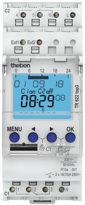 Theben TR 622 top3 Digitale Zeitschaltuhr 2 Kanäle, REG/DIN-Schiene/Hutschiene, 2TE, Wochenprogramm, 230 V, 10 Jahre Gangreserve, App, 2 externe Eingä