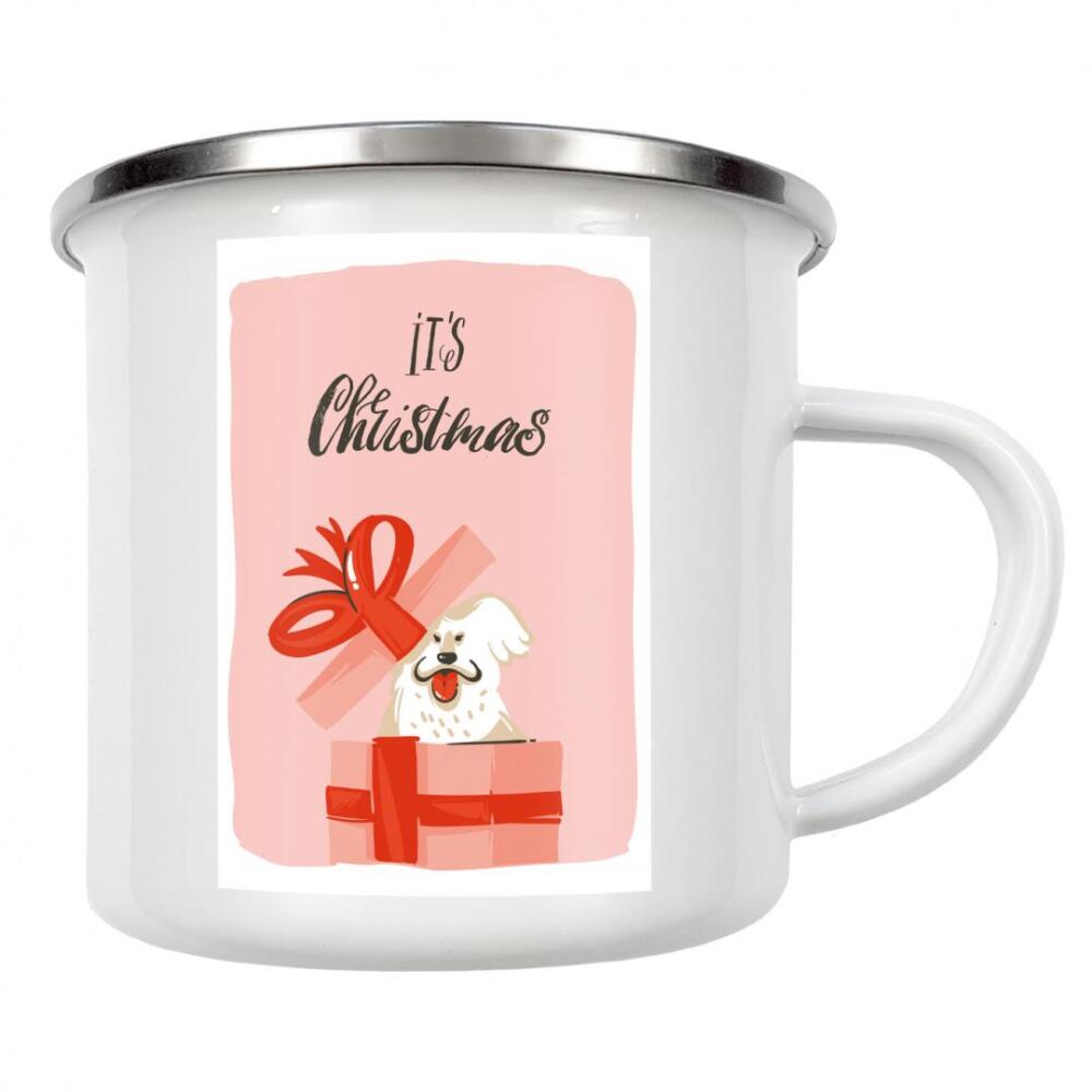 Emaille Tasse "Christmas dog present" artboxONE - Typografie,Tiere,Weihnachten - Weihnachten,Geschenk,Hund,Bunt,Illustration