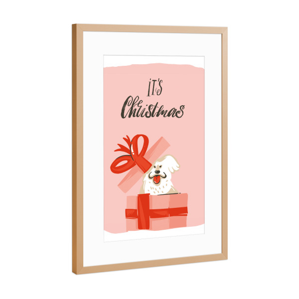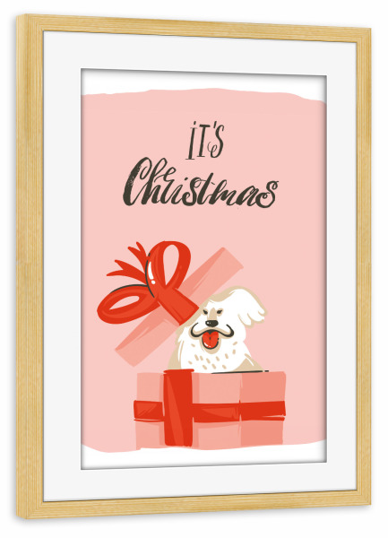 Poster mit Rahmen kiefer "Christmas dog present" artboxONE - Typografie,Tiere,Weihnachten - Weihnachten,Geschenk,Hund,Bunt,Illustration
