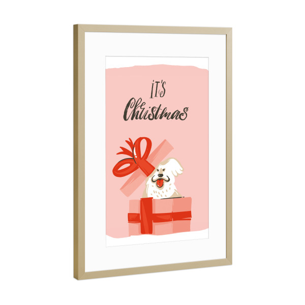 Poster mit Rahmen Gold "Christmas dog present" artboxONE - Typografie,Tiere,Weihnachten - Weihnachten,Geschenk,Hund,Bunt,Illustration