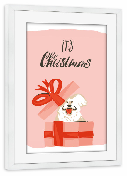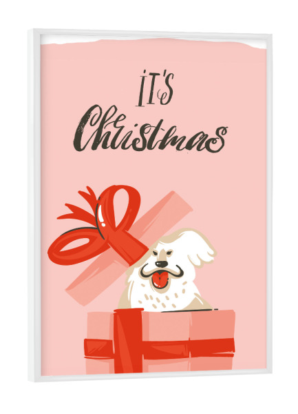 Poster mit Rahmen weiß "Christmas dog present" artboxONE - Typografie,Tiere,Weihnachten - Weihnachten,Geschenk,Hund,Bunt,Illustration