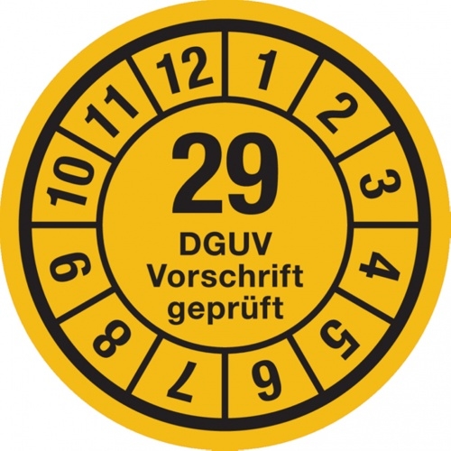 Prüfplakette, Geprüft nach DGUV Vorschrift 3, 2029 - 2034, Dokumentenfolie, Ø 30 mm, Bogen
