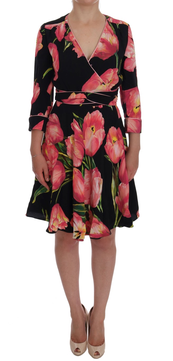 Dolce & Gabbana - Robe droite stretch imprimà e tulipe, noir et rose, pour femme