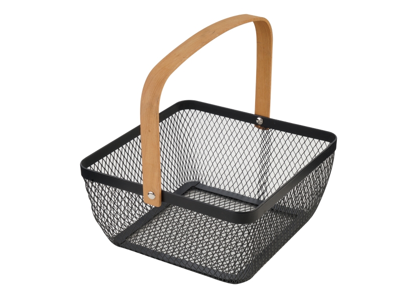 Eva Korb Draht eckig schwarz + Holzgriff 21x21x h 10.5 cm