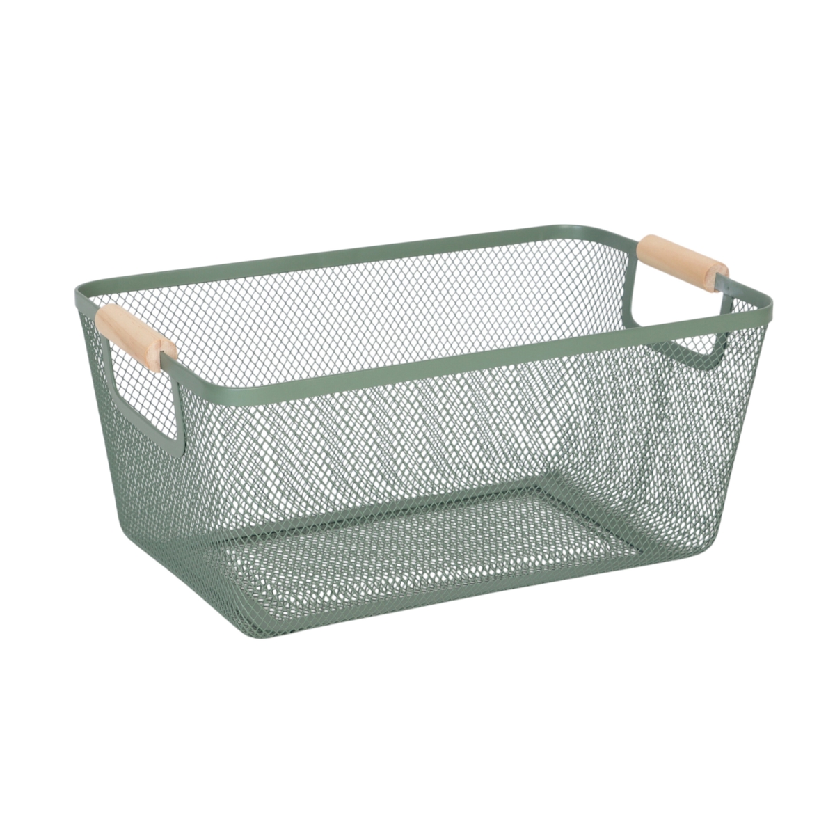 Relaxdays Drahtkorb mit Holzgriffen, eckig, Aufbewahrungskorb Metall, HBT 16,5 x 37 x 22,5 cm, Korb Küche, Bad, mint