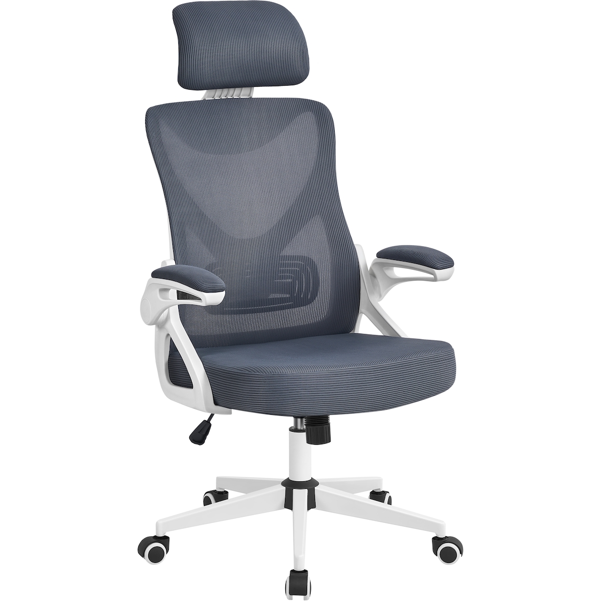 Yaheetech Bürostuhl Ergonomisch, Schreibtischstuhl mit Hochklappbaren Armlehnen, Drehstuhl mit Rückenlehne und Verstellbarer Kopfstütze, Grau