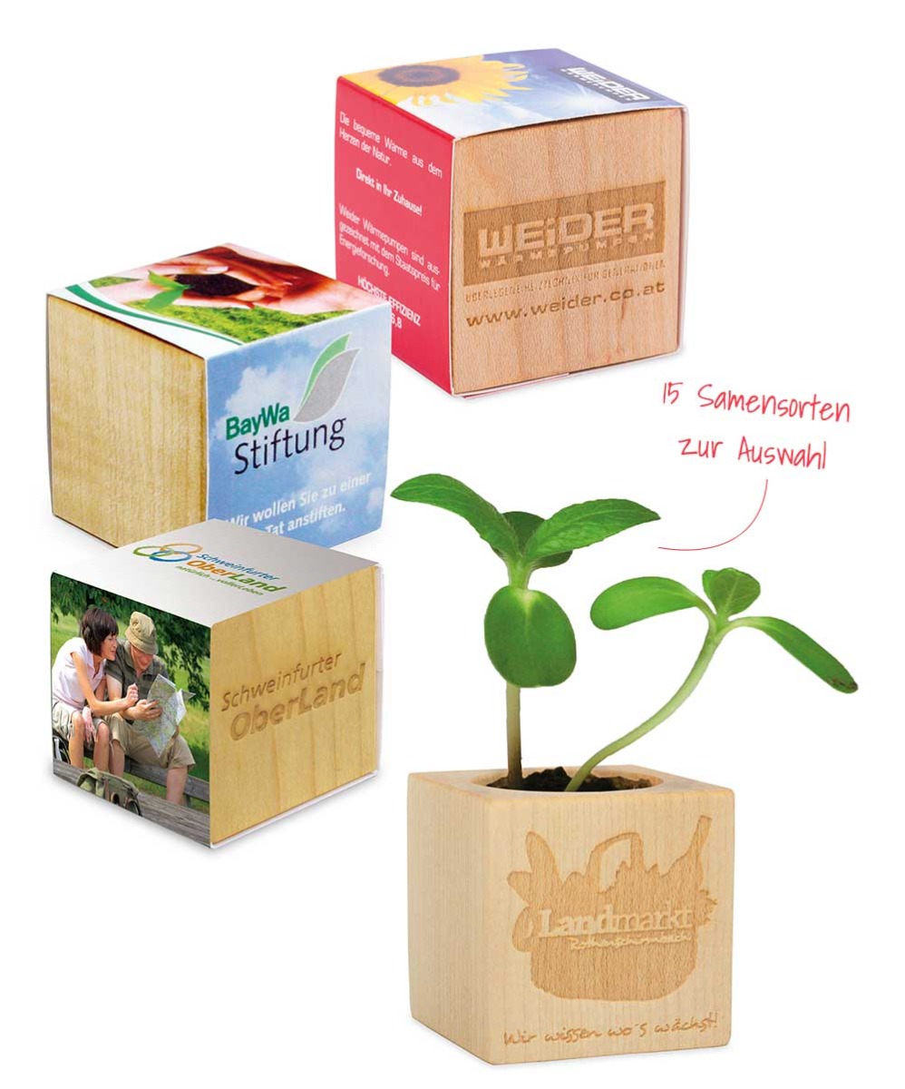 Werbeartikel Pflanz-Holz mit Druck auf Banderole, inklusive Saat und Substrat