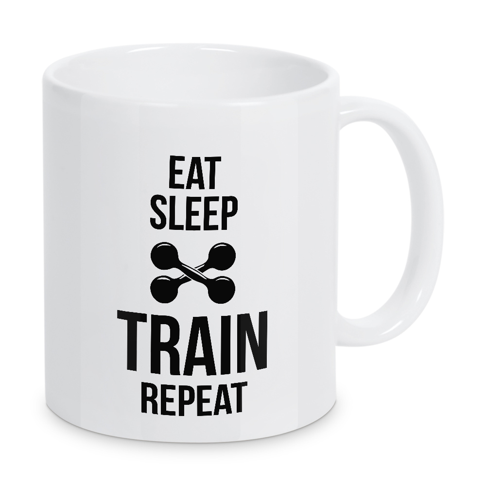 Tasse "Train Repeat" artboxONE - Typografie,Schwarzweiß,Sport,Sport / Motivation - Eat,Sleep,Train,Repeat,Training,Fit,Fitness,Sport,Gym,Dumbbell