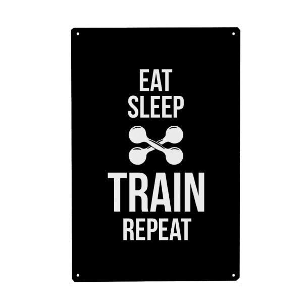 Holzbild "Train Repeat" artboxONE - Typografie,Schwarzweiß,Sport,Sport / Motivation - Eat,Sleep,Train,Repeat,Training,Fit,Fitness,Sport,Gym,Dumbbell