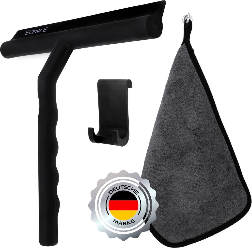 ECENCE Duschabzieher Schwarz Silikon, Duschwischer mit Halterung ohne Bohren + Mikrofasertuch, Fens