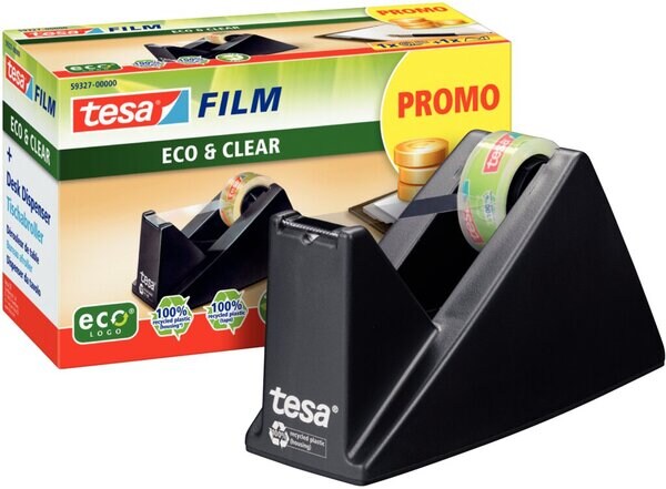 tesa Klebebandabroller tesafilm Easy Cut SMART Schwarz 15 mm (B) x 10 m (L) Kunststoff Recycelt 100% + 1 Rolle tesa Klebefilm Eco & Clear