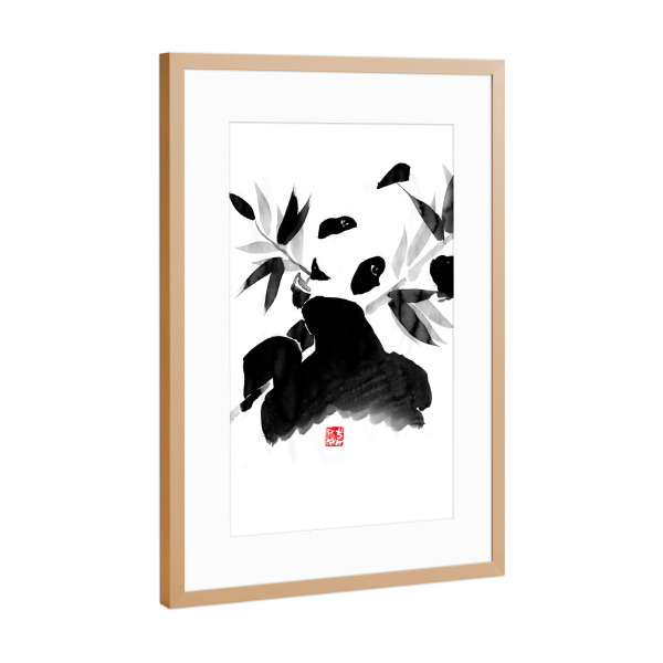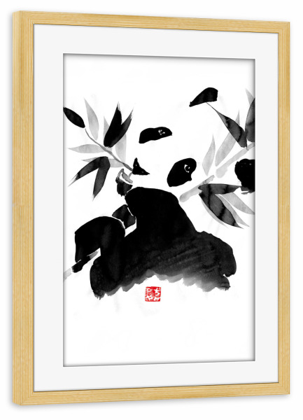 Poster mit Rahmen kiefer "Panda eating" artboxONE - Natur,Tiere,Schwarzweiß - Panda,Bamboo,Japan,Sumie,Black,White,Eating