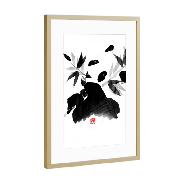 Poster mit Rahmen Gold "Panda eating" artboxONE - Natur,Tiere,Schwarzweiß - Panda,Bamboo,Japan,Sumie,Black,White,Eating
