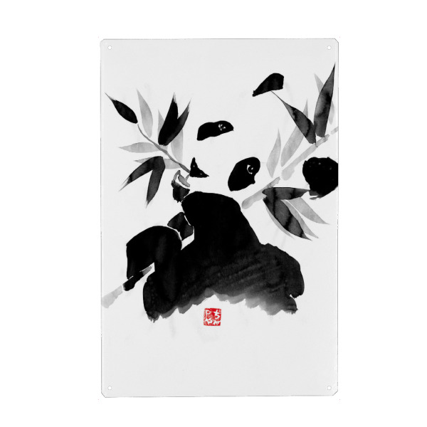 Metall Poster "Panda eating" artboxONE - Natur,Tiere,Schwarzweiß - Panda,Bamboo,Japan,Sumie,Black,White,Eating - Blechschild