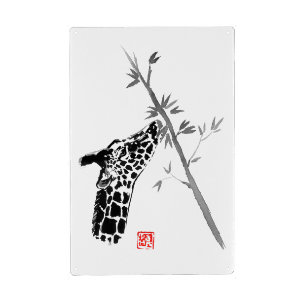 Metall Poster "Giraffe eating" artboxONE - Natur,Tiere - Giraffe,Tree,Sumie,Japan,Tier,Animal,Natur,Nature,Schwarzweiß,Blackandwhite - Blechschild