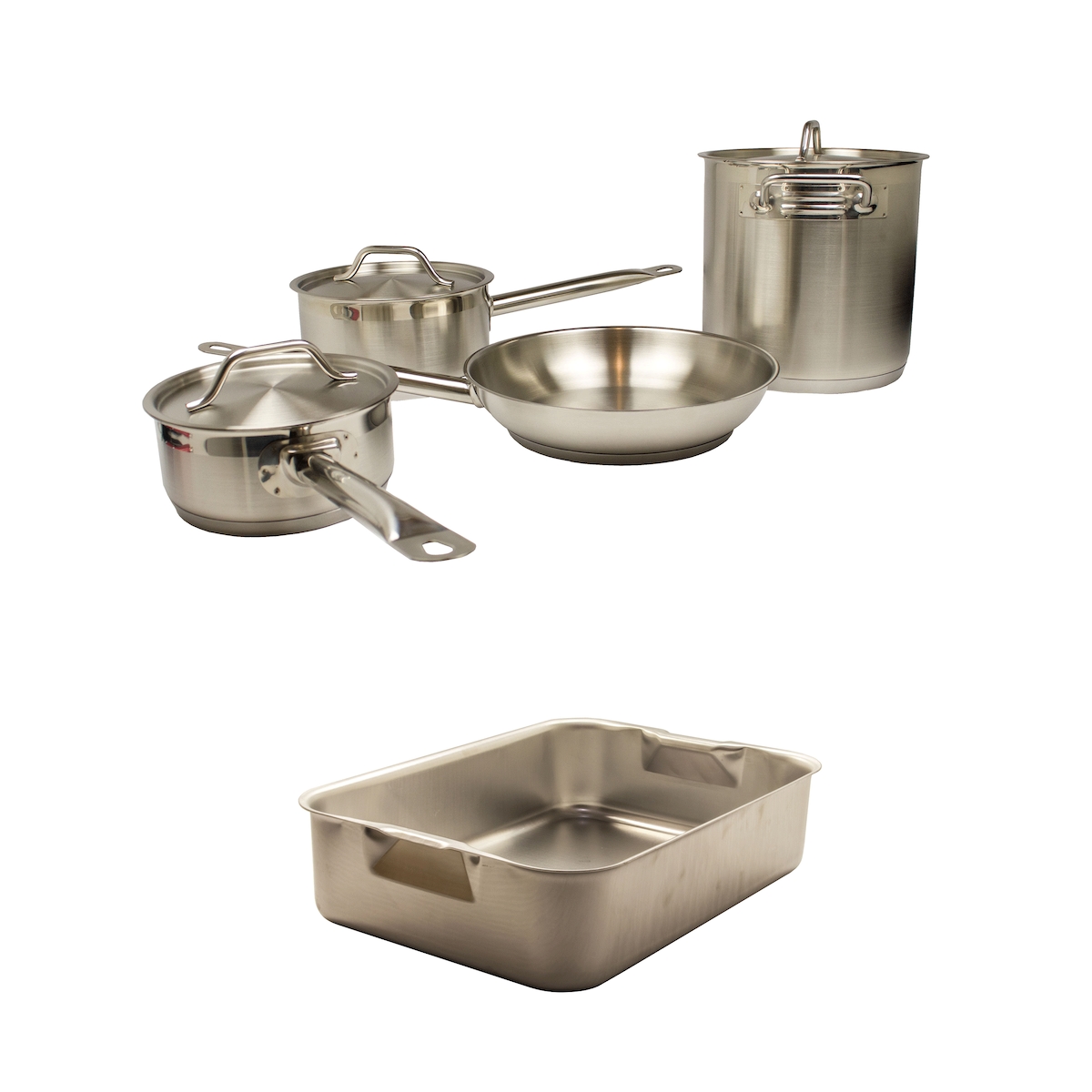 5-teiliges Kochgeschirr / Topfset bestehend aus zwei Soßenpfannen, einem Topf und einer Bratpfanne - Induktion - Edelstahl + Bräter