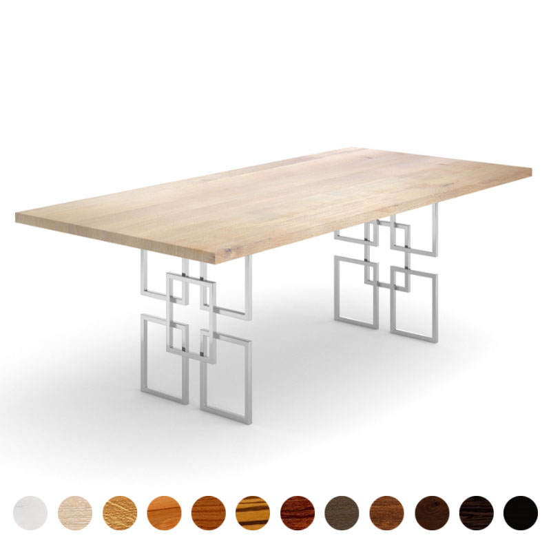 Esstisch mit massiver Holzplatte Eiche-gekälkt und Retro-Gestell aus Edelstahl Parma
