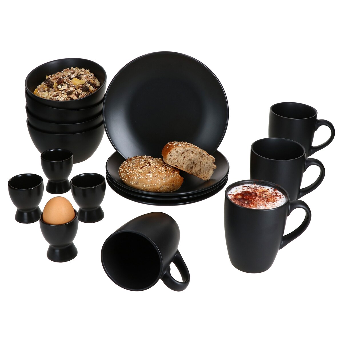 Nero 16tlg Frühstücksset matt schwarz Steingut Teller Becher Schalen Eierbecher