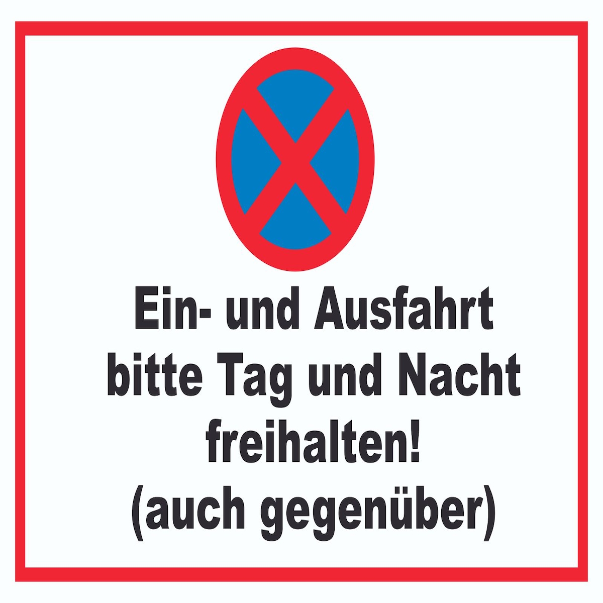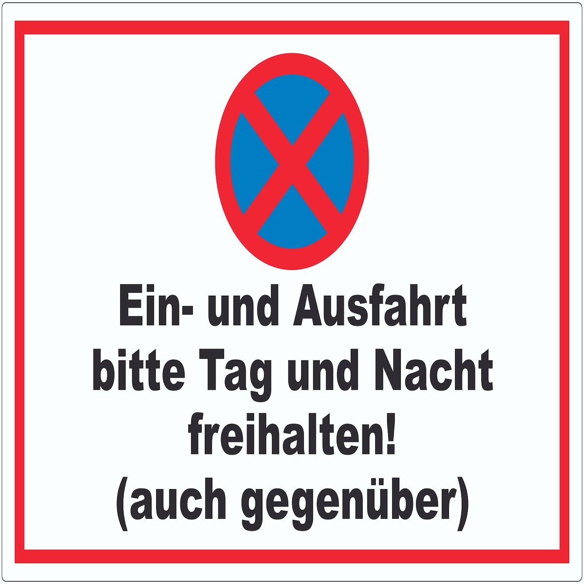 Parken verboten Ein- und Ausfahrt Tag und Nacht freihalten auch gegenüber Schild A1 Rückseite selbstklebend