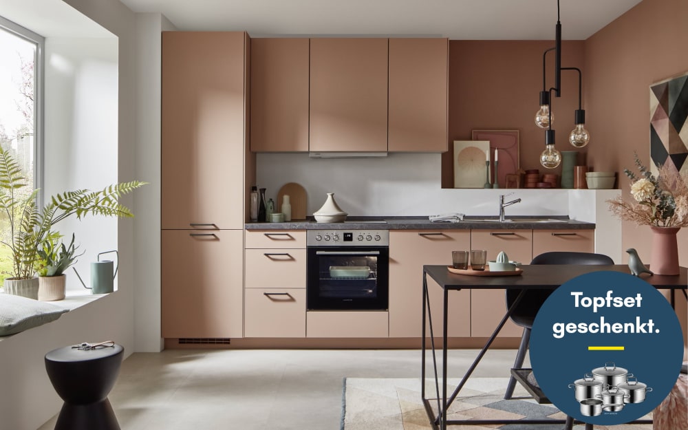 Nobilia Einbauküche Senso, koralle/Nussbaum Nachbildung, inkl. Elektrogeräte rosa Lack