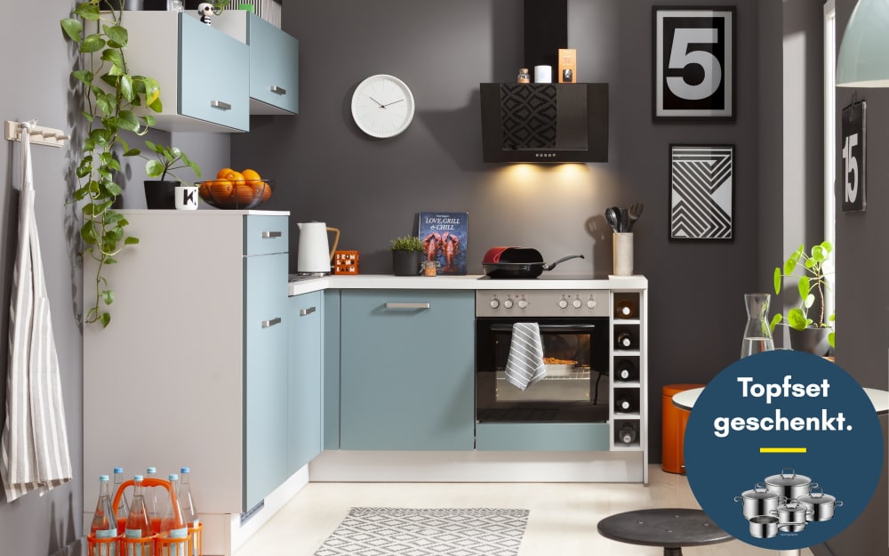 Impuls Einbauküche IP1200, patrol/weiß, inkl. Siemens Elektrogeräte türkis