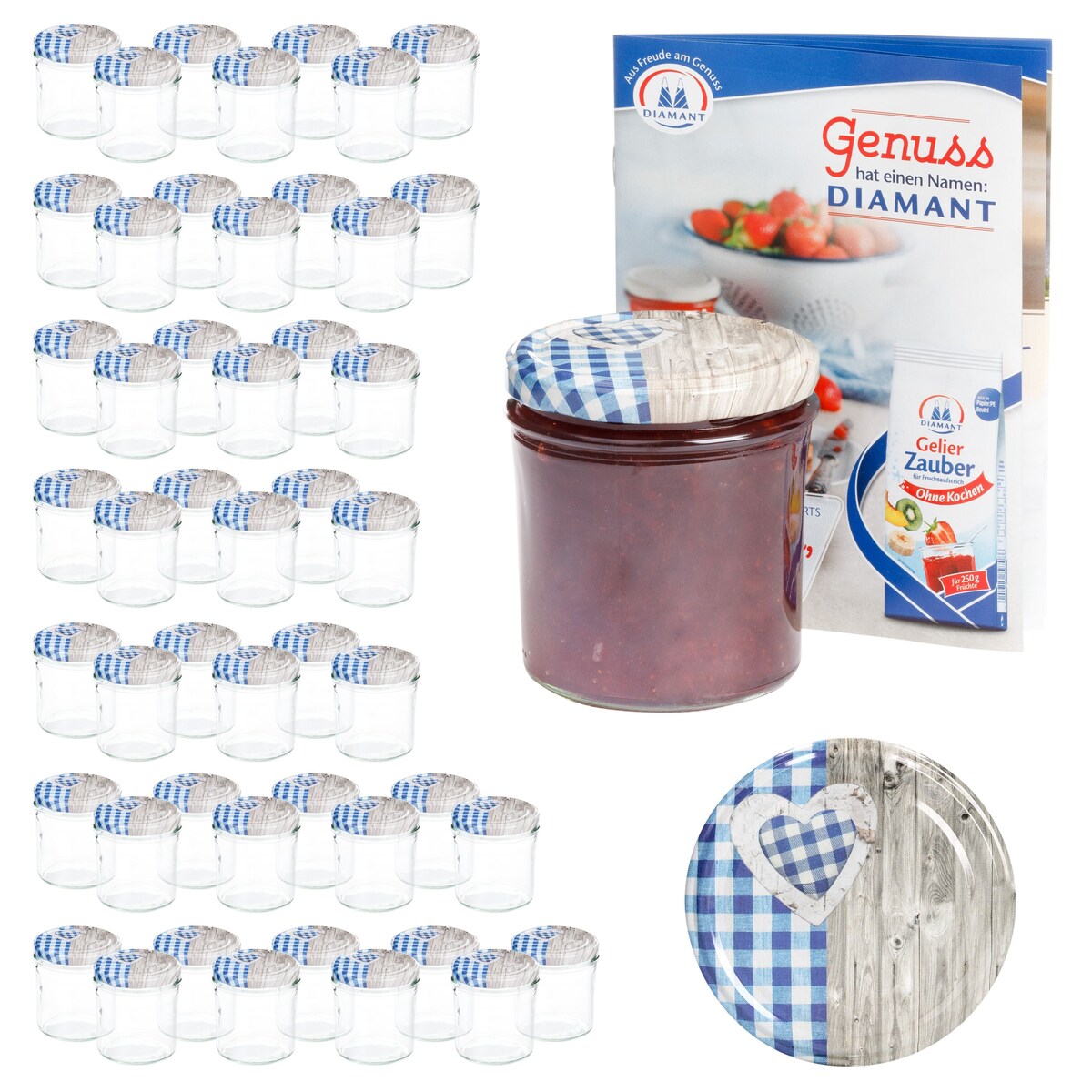 50 Sturzgläser 350 ml Deckel Herz Holz blaukariert Einmachglas Einweckglas Glas