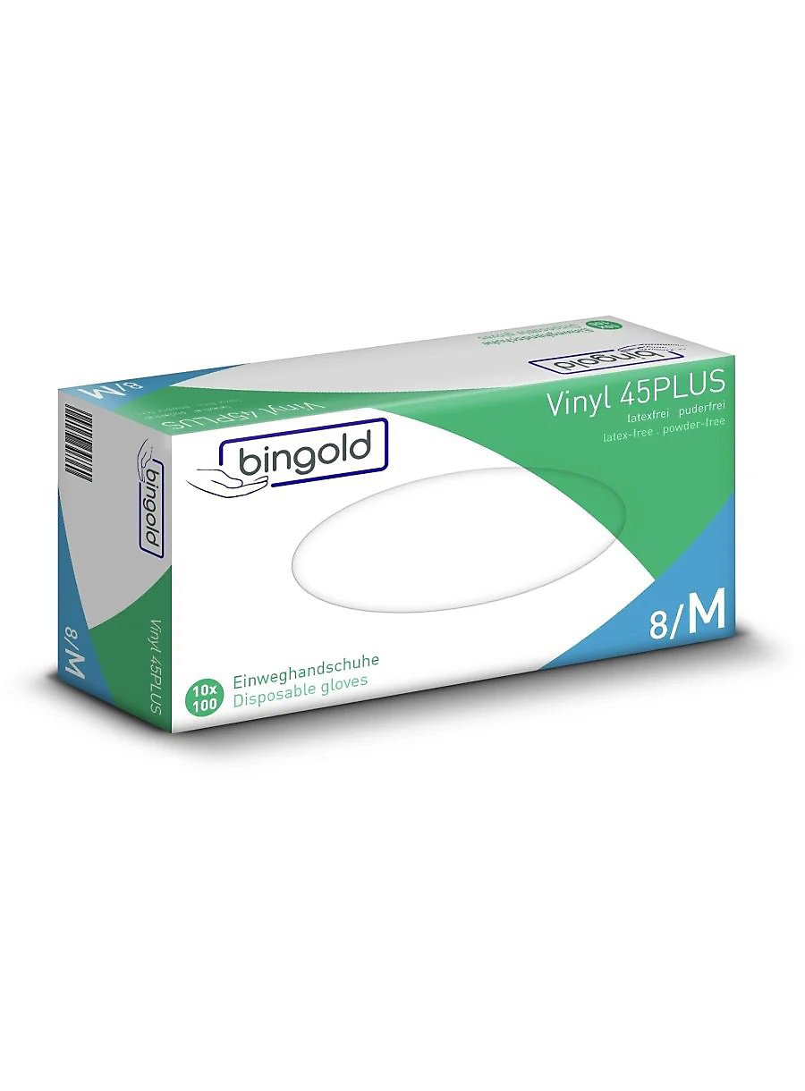 BINGOLD Vinyl 45PLUS Einweghandschuhe Transparent puderfrei 100 Stück : L