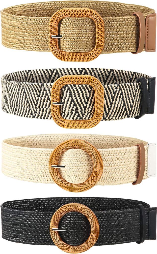 4 Pieces Straw Woven Elastic Stretch Waist Belt Women Skinny Dress Belt Wooden Style Buckle Waist Dress Band