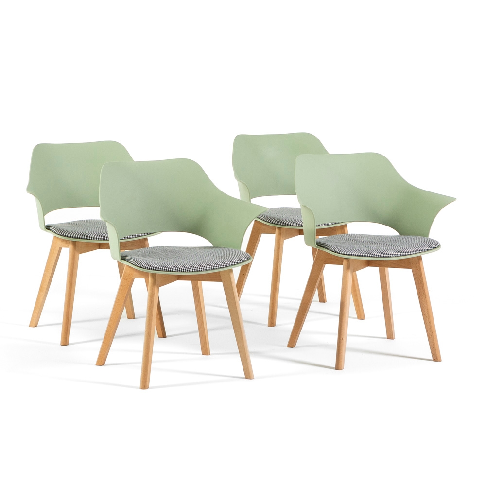 RATTATAN 4er-Set Indoor-Stühle mit Holzbeinen, ergonomischer Kunststoffschale und Sitzkissen im Hahnentritt-Design für Küche, Esszimmer, Bar,
