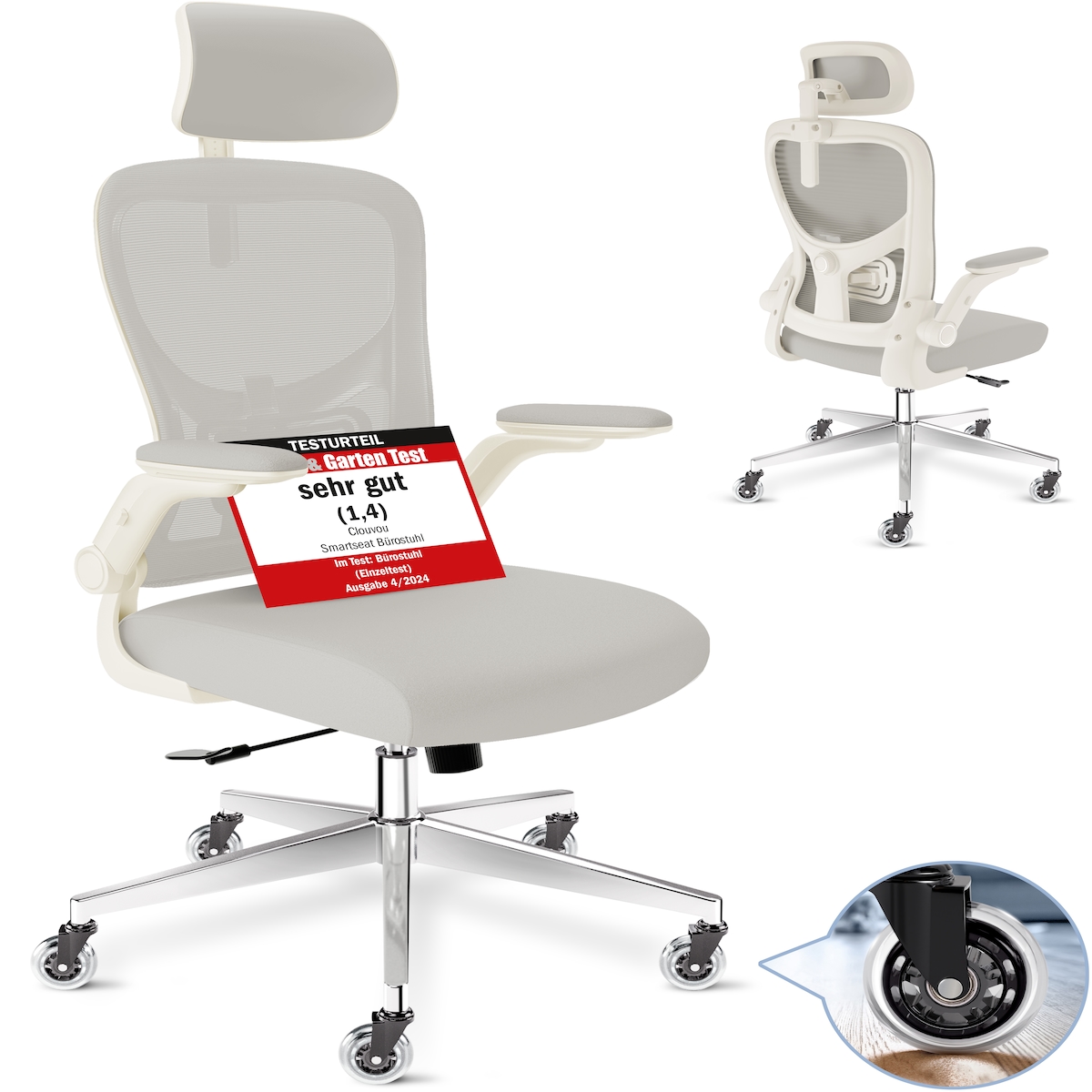 CLOUVOU SmartSeat, ergonomischer Bürostuhl, Rückenlehne mit Mesh Bezug, FlipUp-Armlehnen, 3D-Kopfstütze, BladeWheels, Creme-weiß